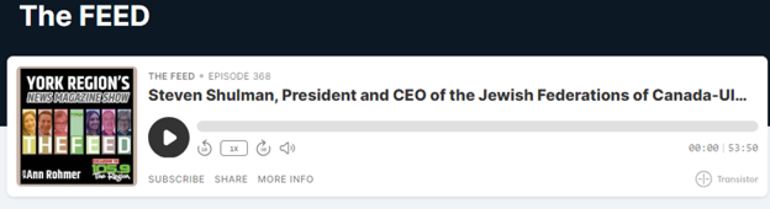 Steven Shulman, President and CEO of Jewish Federations of Canada-UIA and Sarah Mali, Director General, Israel, have appeared in various media outlets, which can be found below.