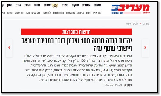 The Jewish Federations of North America in general (the JFNA) have set a fundraising goal of 500 million dollars for the State of Israel and the southern settlements in particular. The donations will be dedicated for financial aid, for the victims of terrorism, the rehabilitation of the settlements that were damaged and destroyed and the financing of emergency medical equipment, food and supplies to help the evacuees and the injured in cooperation with the Jewish Agency and the Joint.